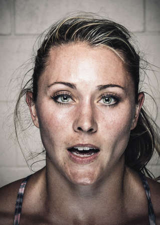 Portrait of sweaty young woman with open mouth after workout