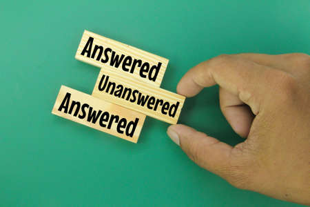 wooden boards with words answered and unanswered. hand picking has not been answered