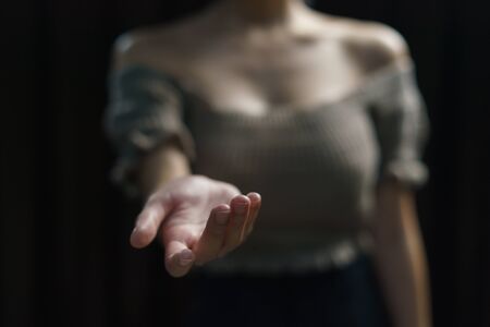 Woman open empty hand on black background.
