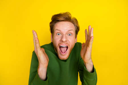 Photo of funky impressed guy dressed green sweater open mouth rising arms isolated yellow color background