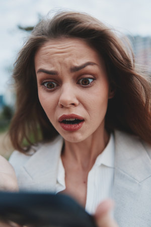Woman shocked by financial crisis looking at phone, upset young Caucasian female in business attire outdoors with blurred city background, anxious emotion, stock market drop theme