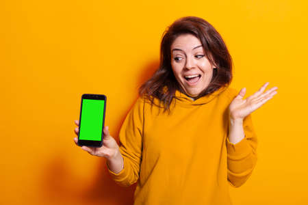 Woman holding smartphone with green screen on display. Positive adult showing isolated mockup template with chroma key on smartphone over orange background in studio. Person using phone