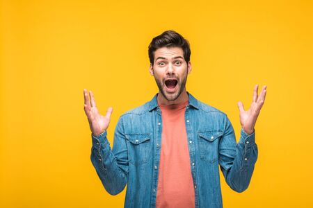 Excited handsome man gesturing with hands and looking at camera isolated on yellow background