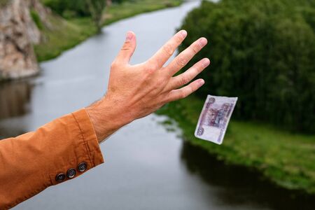 a flying bill and a hand with an open palm on the background of a natural landscape