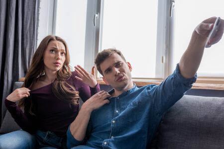 Frustrated young couple sitting on the couch and quarreling with each other at home. Physical aggression concept. High quality photo