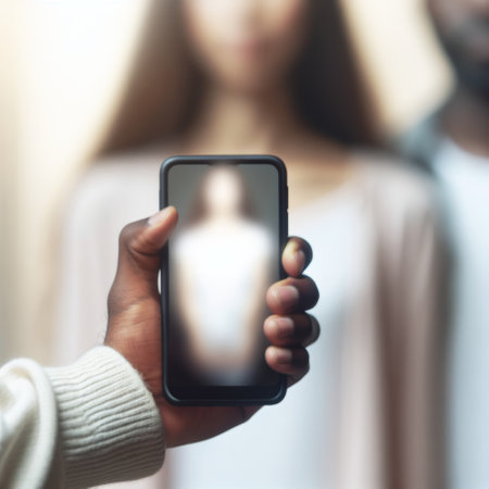 A persons hand gripping a smartphone, a softly blurred figure in the background. AI generated.