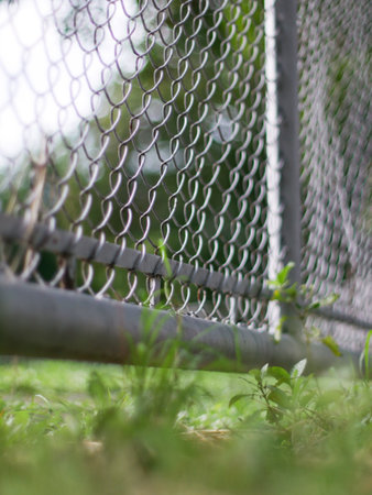 Close-up shot of metal chain-link fence lines with blurred edges, representing strength and separation in urban setting