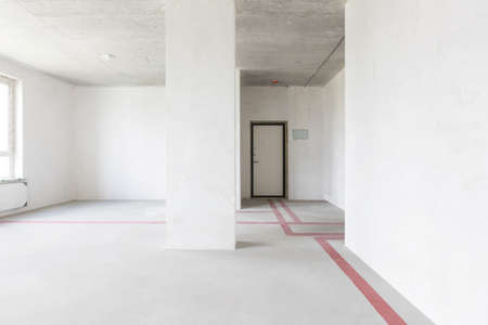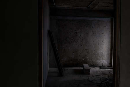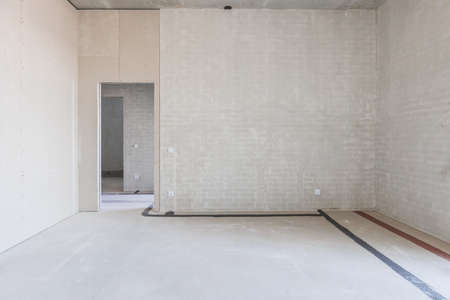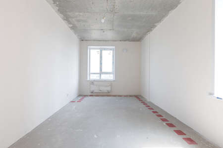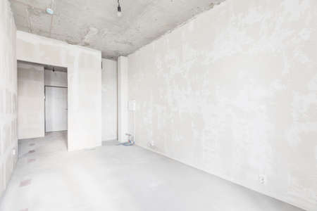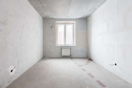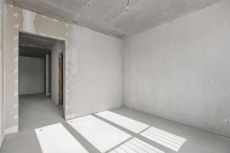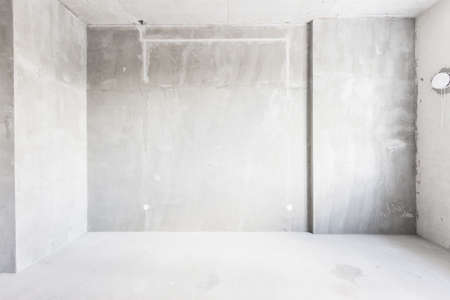 Empty living room in a country house without repair. Unfinished room with concrete walls and ceiling