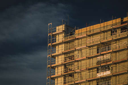 Making new facade on an old city block. Visible metal scaffolding tower and blue evening sky in the background.