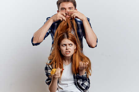 Man with a beard on a white isolated background with a beautiful young woman, quarrel, scandal, emotion, hair.