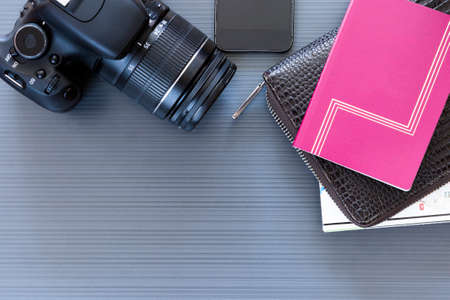 top view of a desktop with a travel stuff consisting on a camera, a passport, a documents case, a phone and a map on a desk background - suitable for copy space