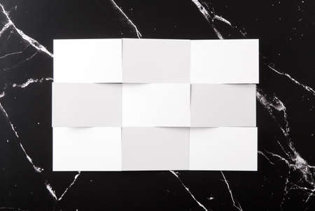 Photo of white business cards on black marble. Template for branding identity isolated on marble background. Business Card isolated on marble stone.