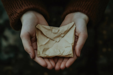 Woman holding a crumpled brown envelope in her open hands, conveying a sense of mystery, lost message, or forgotten memories