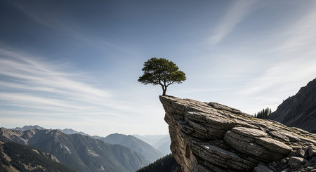 Majestic lone tree standing tall on a foggy cliffside, surrounded by mist and serene nature beauty.