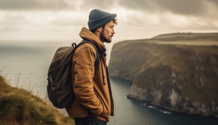 Hiker standing on cliff enjoying breathtaking ocean view, inspiring travel and adventure concept
