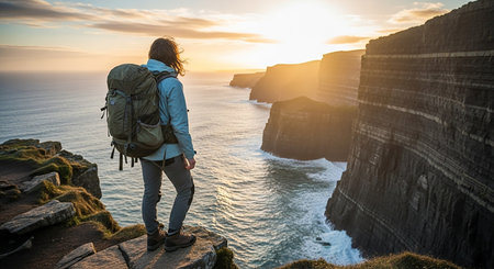Hiker with backpack looking at sunset in Cliffs of Moher