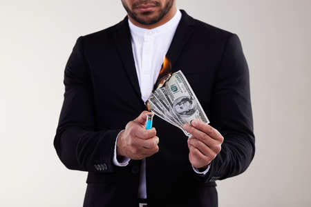 Ive got money to burn. Studio shot of an unrecognisable businessman burning a banknote against a white background.