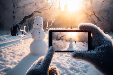 smartphone in the hands of a tourist taking a photo of a friendly snowman in a city park on a frosty winter day.