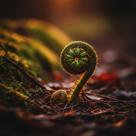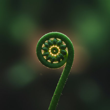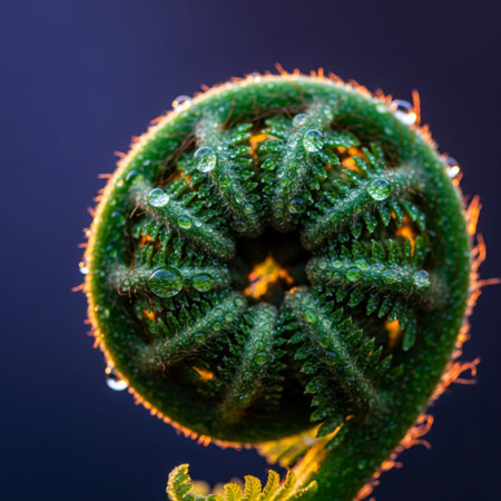 A macro photograph captures a vibrant green fern frond with a tightly coiled spiral unfurling, illuminated by soft light against a dark, blurred...