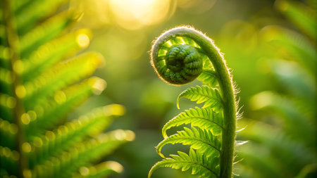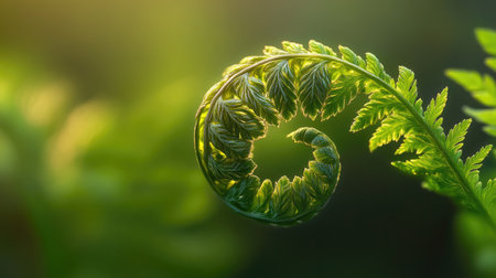The image features a close-up of a fern frond as it unfurls, showcasing a spiral pattern. The vivid green color and intricate details are highlighted against a blurred background. The style suggests a natural environment with soft lighting. Suitable for illustrations in various projects.