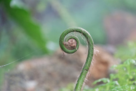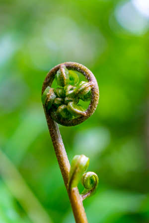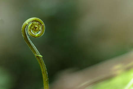 closeup of young curly fern bud with blurred background