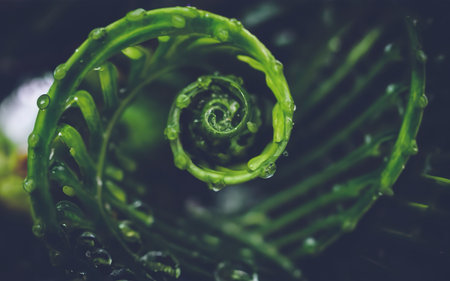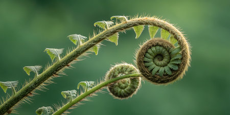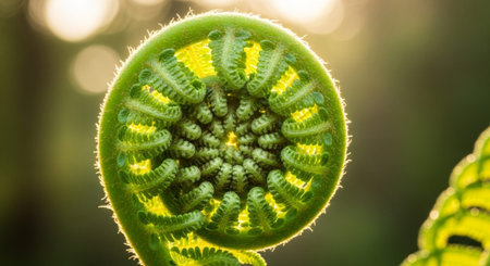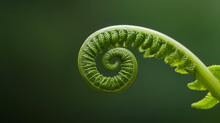 The intricate spiral pattern of an unfurling fern illustrating the natural beauty and perfection of nature's design.