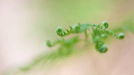 Close up of a square-shaped fern frond's bud with spiral growth and delicate green leaves
