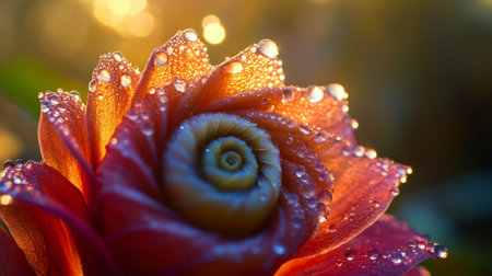 Rare exotic flower with spiral-shaped petals, covered in morning dew, shining under the warm sunlight. generative ai