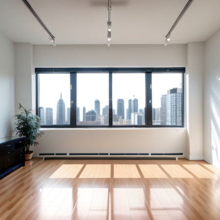 Interior of empty open space in modern Glossy large windows with city