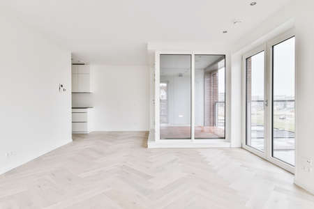 Interior of empty white room with large windows and glass door and wooden parquet floor