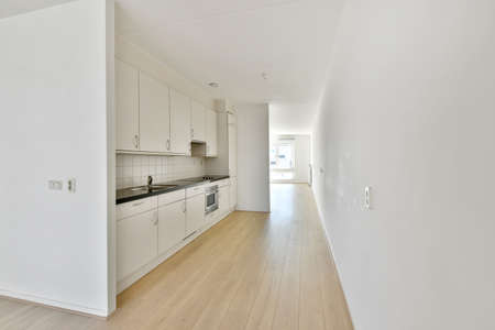Interior of empty white kitchen with corridor and wooden parquet floor