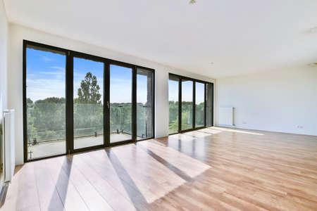 Interior of empty white room with large balcony windows and wooden parquet floor