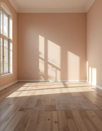 3d render of empty room with sunlight coming through the window.