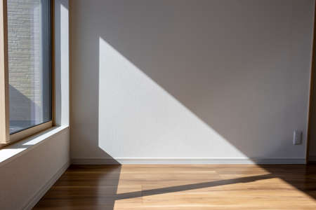 shadow of soft sunlight through fabric window blinds curtain on the floor empty room in door, evening sunshine feeling relax, warm, comfort like hometown, interior design idea, angle view from floor