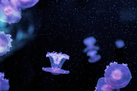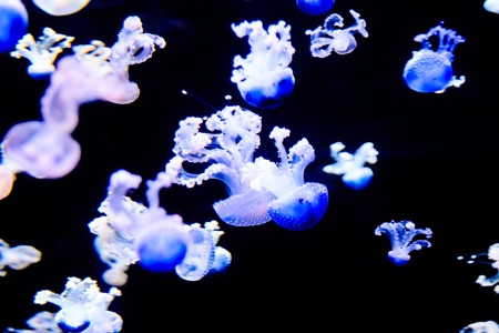 Group of Sanderia Malayensis, Amakusa Jellyfish swimming in aquarium pool with blue neon light. Theriology, biodiversity, undersea life, aquatic organism