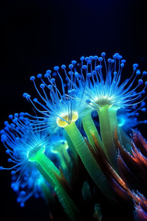 close-up of coral polyps capturing plankton in the dark, created with generative ai