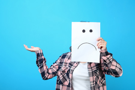 Depressive emotions concept, smiley face emoticon printed depression and sad pessimistic face sadness