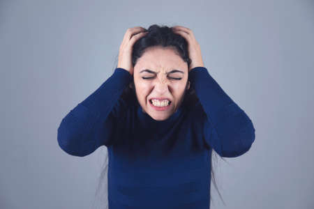 Attractive Latin woman holding her head with an angry expression on a pure white background.