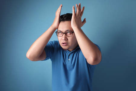 Young Asian man wearing blue shirt shouting because of anger. Against blue background
