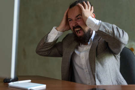 young bearded businessman yelling holding his head with his hands, looking at the computer monitor screen. Headache, tension at work, stress A screaming worried, depressed, and stressed out businessman holds his head
