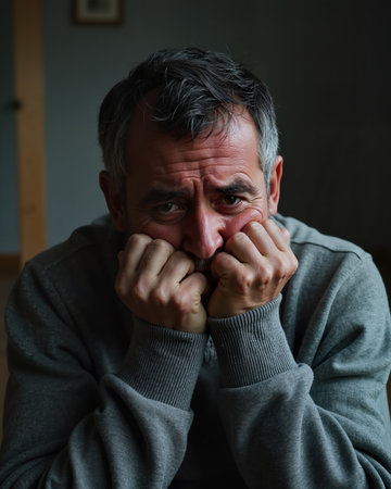 Middle-aged man with gray hair and worried eyes, frowning and resting chin on clenched hands, wearing a gray sweater, conveying anxiety and concern.