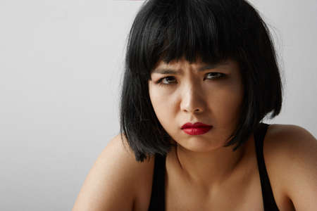 Front view of young Chinese woman with short hair and angry face posing on the white background. Isolated.