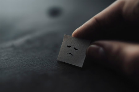 Close-up of a hand holding a piece of paper with a simple, sad emoticon. A dark, moody atmosphere.
