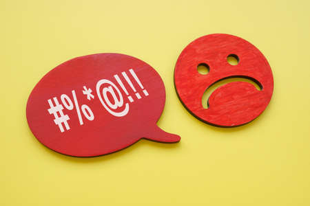 Hate speech or rudeness concept. Unhappy face and quote bubble.