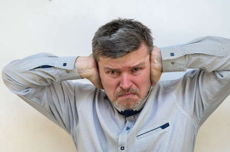 A mature man in a state of psychological stress in front of a light wall. A male with a short haircut and graying hair covers his ears with his hands. People, Human Emotions