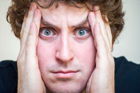 Young man frustrated and suffering headache, close up