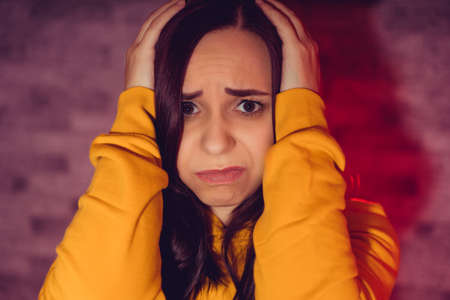 Portrait of unhappy young woman holding her head with hands. Close up of sad female in yellow hoodie clutching head from headache
