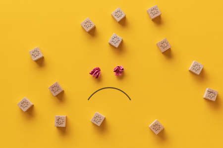 Sad face drawn on yellow background with many wooden blocks with covid19 molecules on them around it.