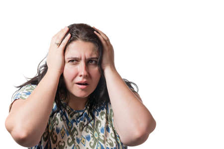 Unhappy brunette young woman holding hands on her head isolated on white background.
