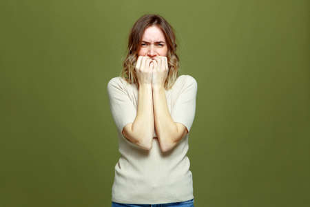 Stressed nervous scared young woman biting nails fingers, suffer from domestic violence or abuse, feel frightened